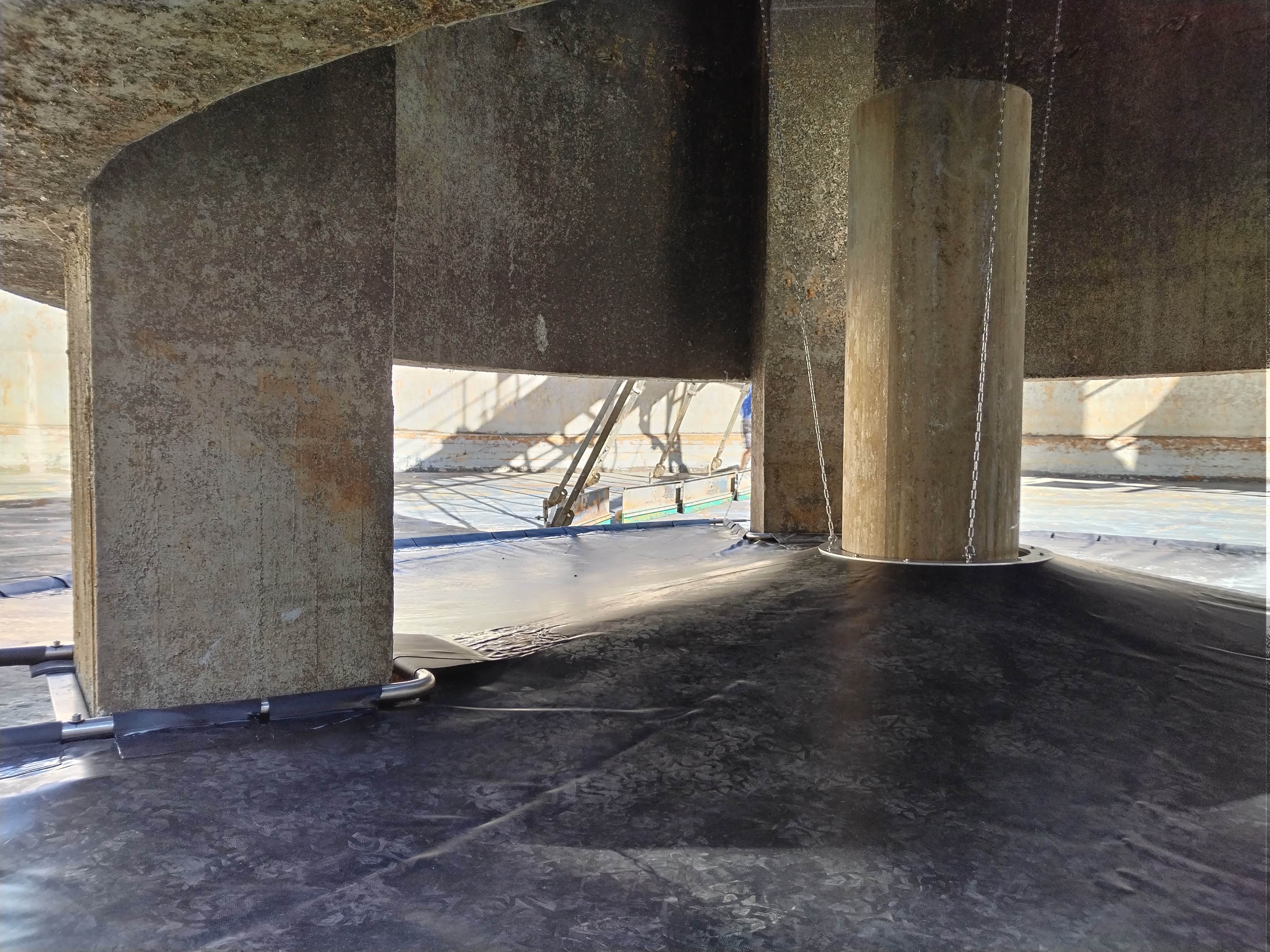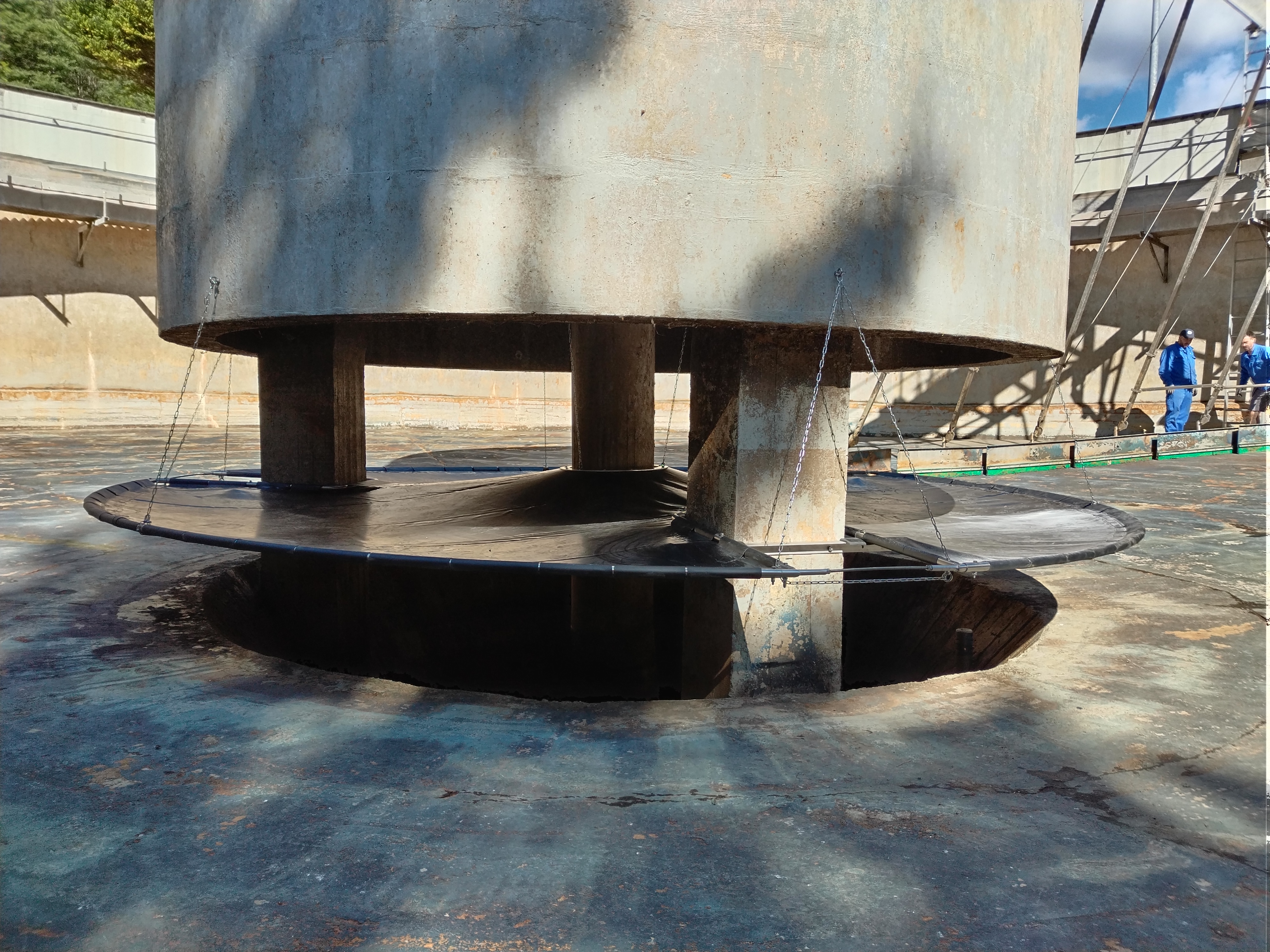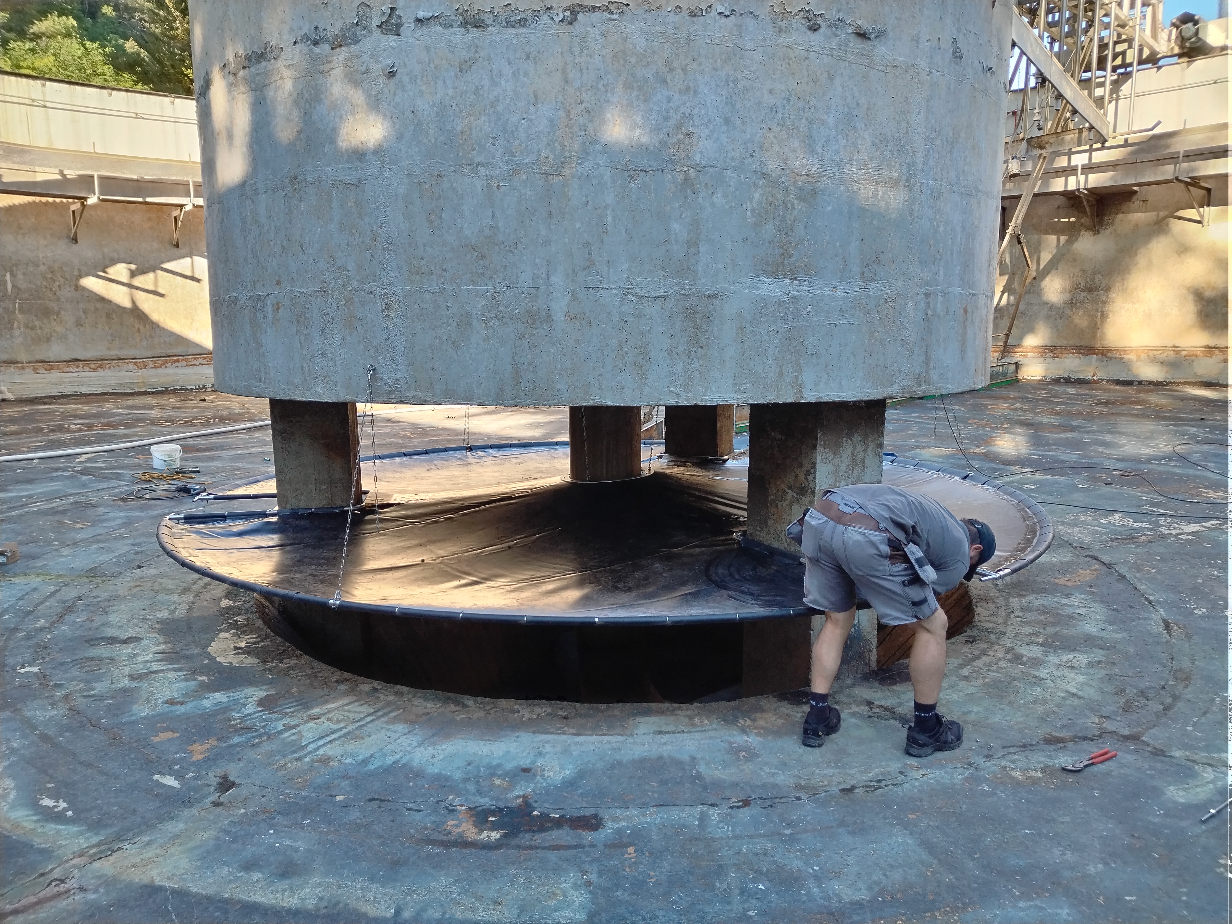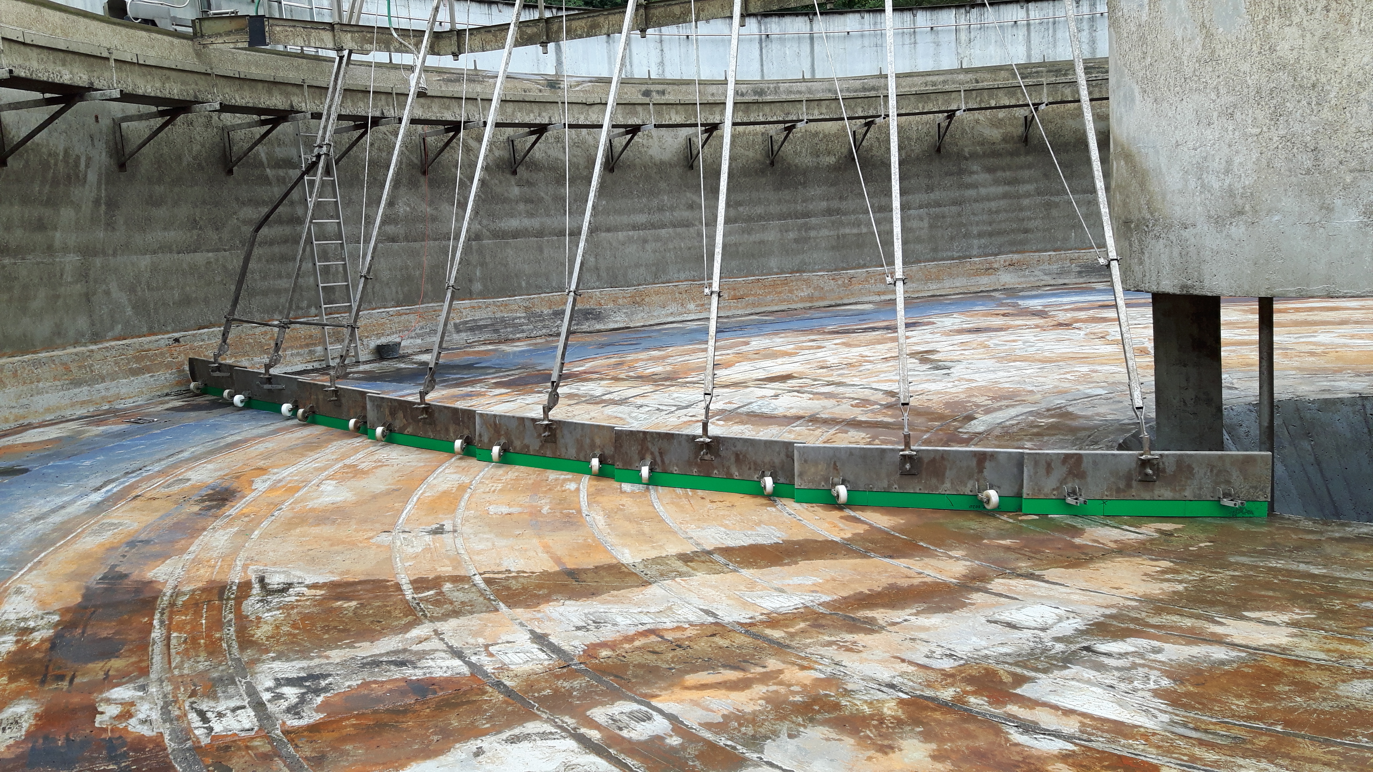 So kam es, daß wir nach langen Überlegungen selbst aktiv wurden: wir wollten es einfach austesten, ob man eine Verbesserung im Betrieb erreichen kann. Dazu haben wir eine eigene Rohrkonstruktion aus Edelstahlrohren mit einer PVC-Teichfolie als Strömungsleitplane bespannt und in eines der beiden Nachklärbecken eingebaut. Die Materialkosten dazu waren verhältnismäßig gering, alle Schweiß- und Montagearbeiten wurden von uns selbst ausgeführt. Aus Gründen der Stabilität und Sicherheit wollten wir die Konstruktion aber nicht mehr höhenverstellbar einsetzen, wie ursprünglich geplant. Der Versuchs-Einbau erscheint uns trotzdem sehr gelungen, das Becken konnte anschliessend wieder gefüllt und in Betrieb genommen werden.