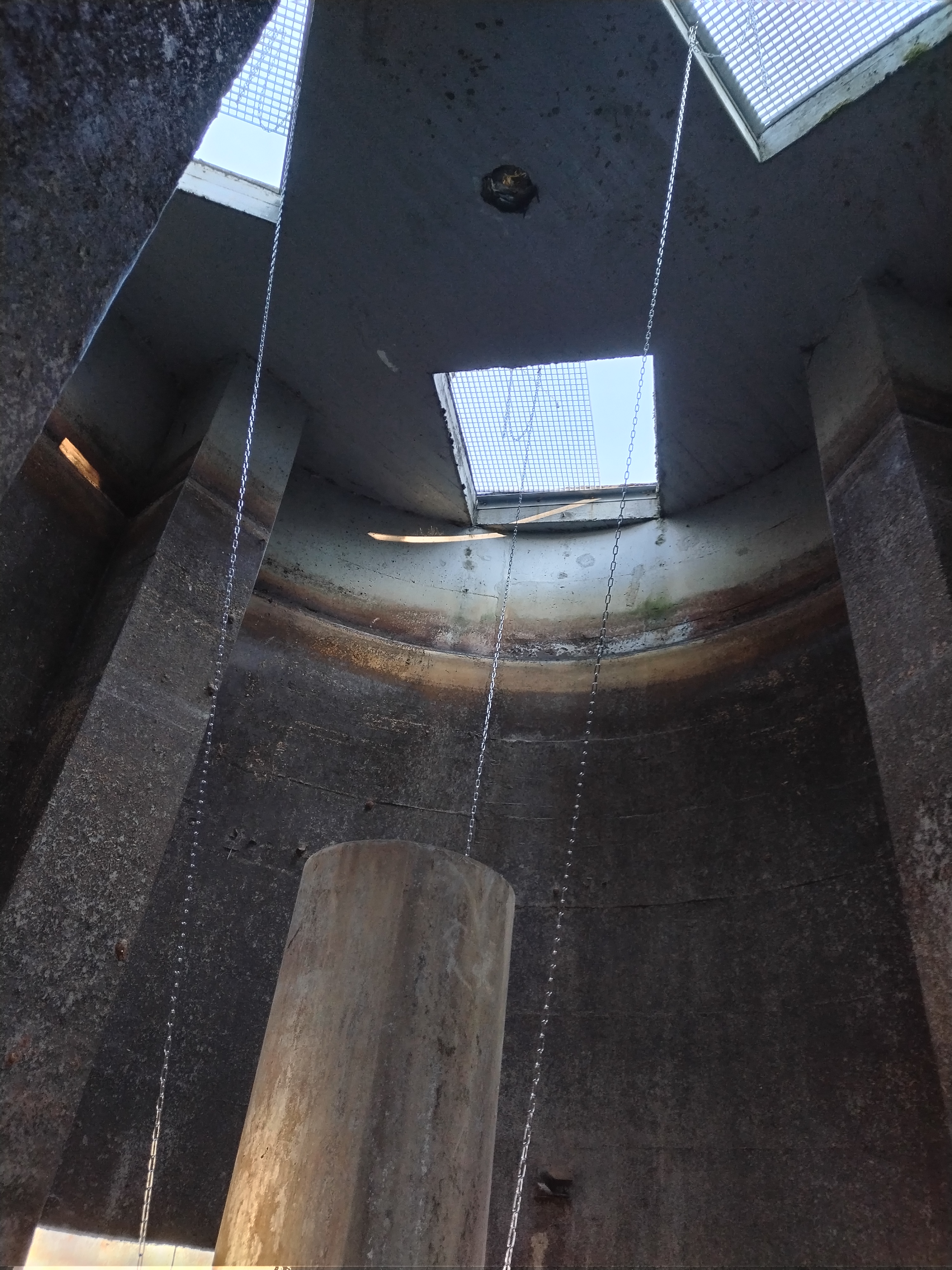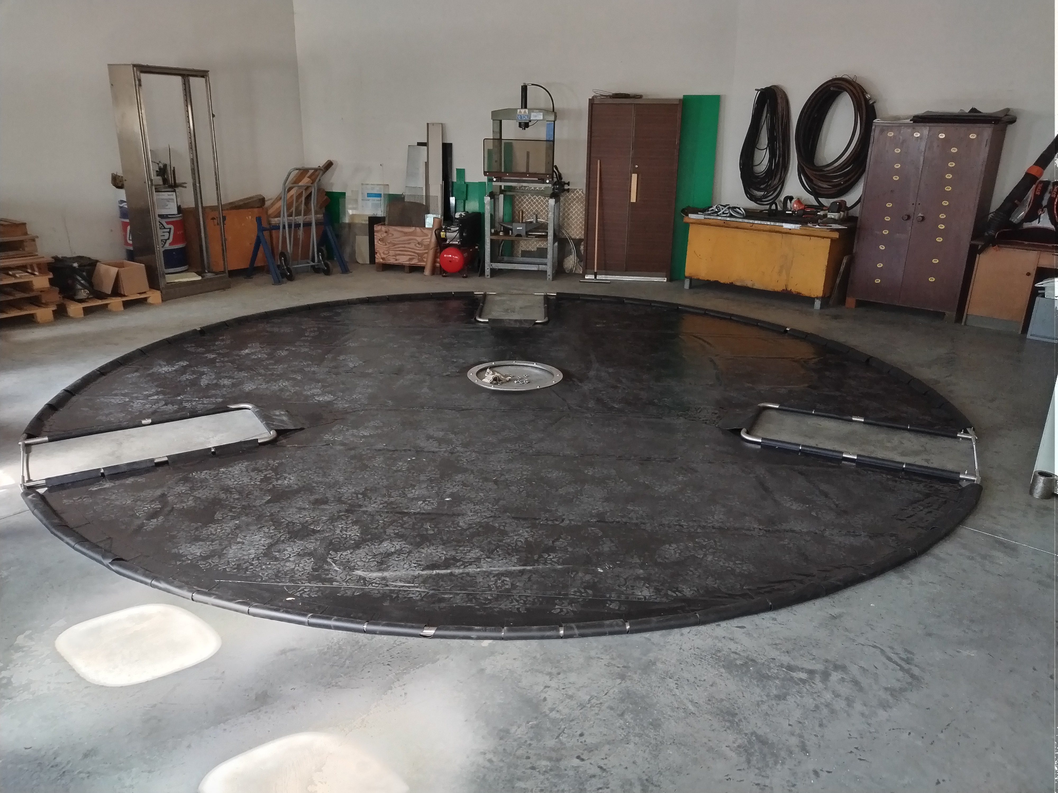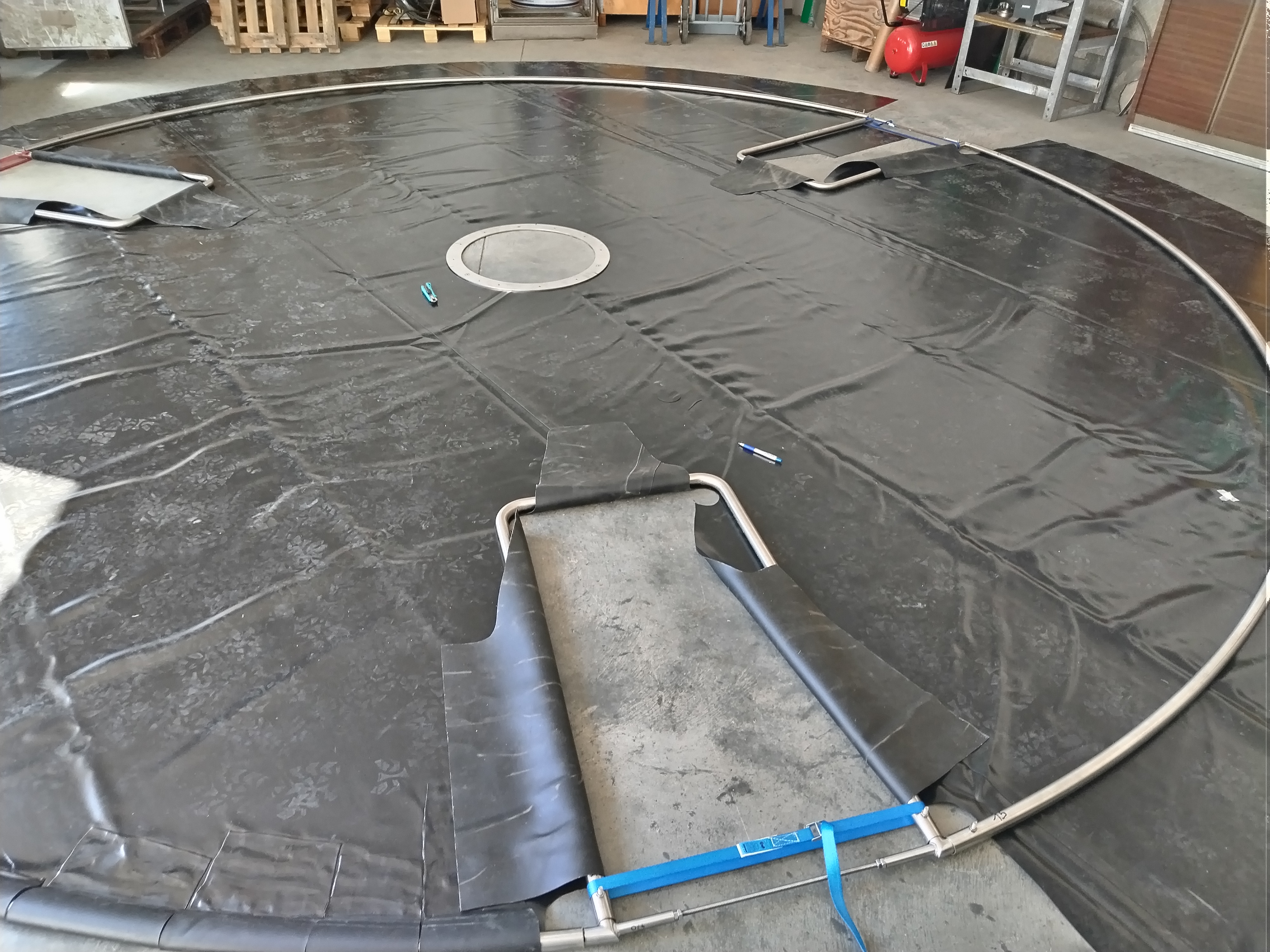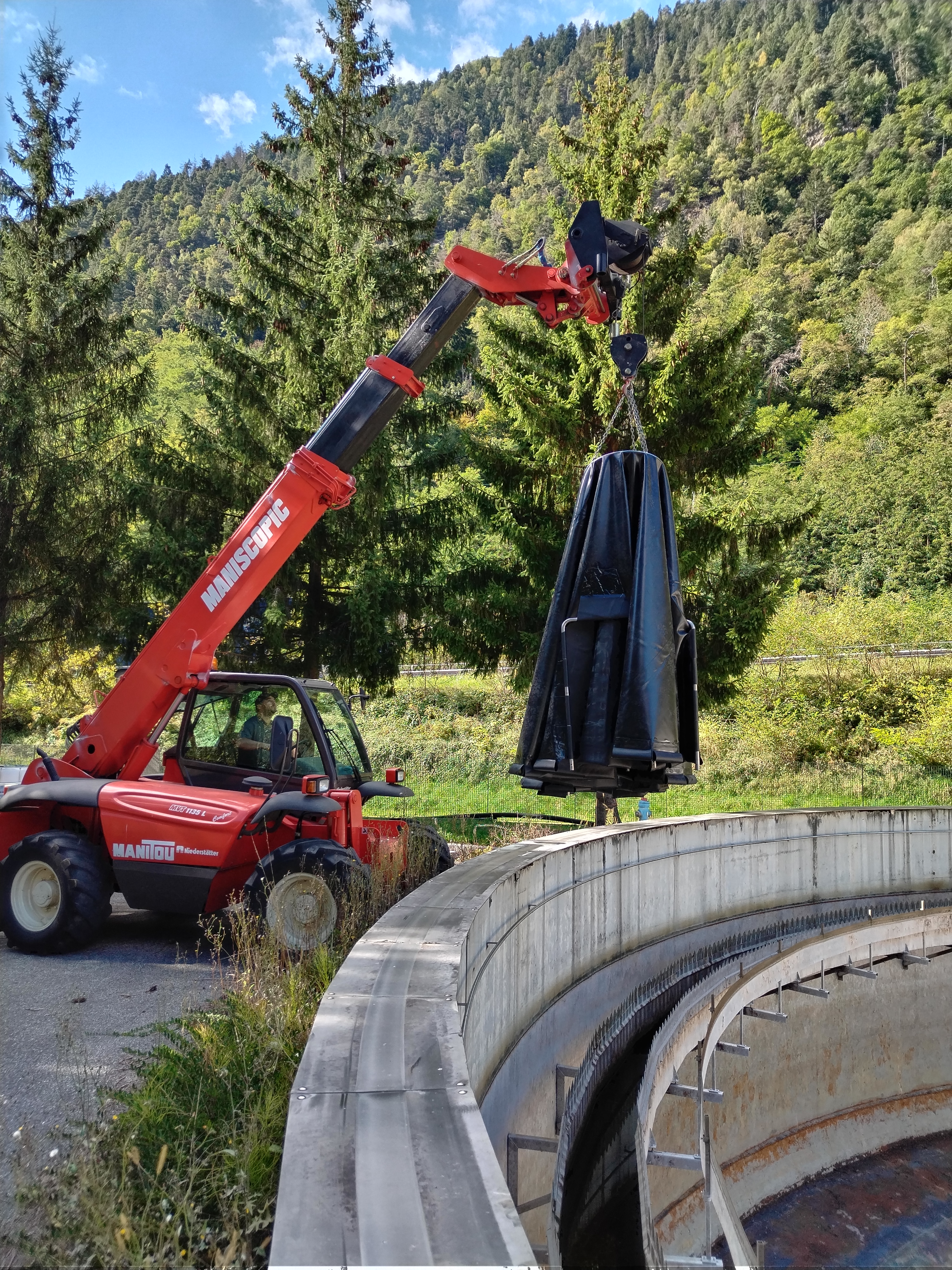 So kam es, daß wir nach langen Überlegungen selbst aktiv wurden: wir wollten es einfach austesten, ob man eine Verbesserung im Betrieb erreichen kann. Dazu haben wir eine eigene Rohrkonstruktion aus Edelstahlrohren mit einer PVC-Teichfolie als Strömungsleitplane bespannt und in eines der beiden Nachklärbecken eingebaut. Die Materialkosten dazu waren verhältnismäßig gering, alle Schweiß- und Montagearbeiten wurden von uns selbst ausgeführt. Aus Gründen der Stabilität und Sicherheit wollten wir die Konstruktion aber nicht mehr höhenverstellbar einsetzen, wie ursprünglich geplant. Der Versuchs-Einbau erscheint uns trotzdem sehr gelungen, das Becken konnte anschliessend wieder gefüllt und in Betrieb genommen werden.