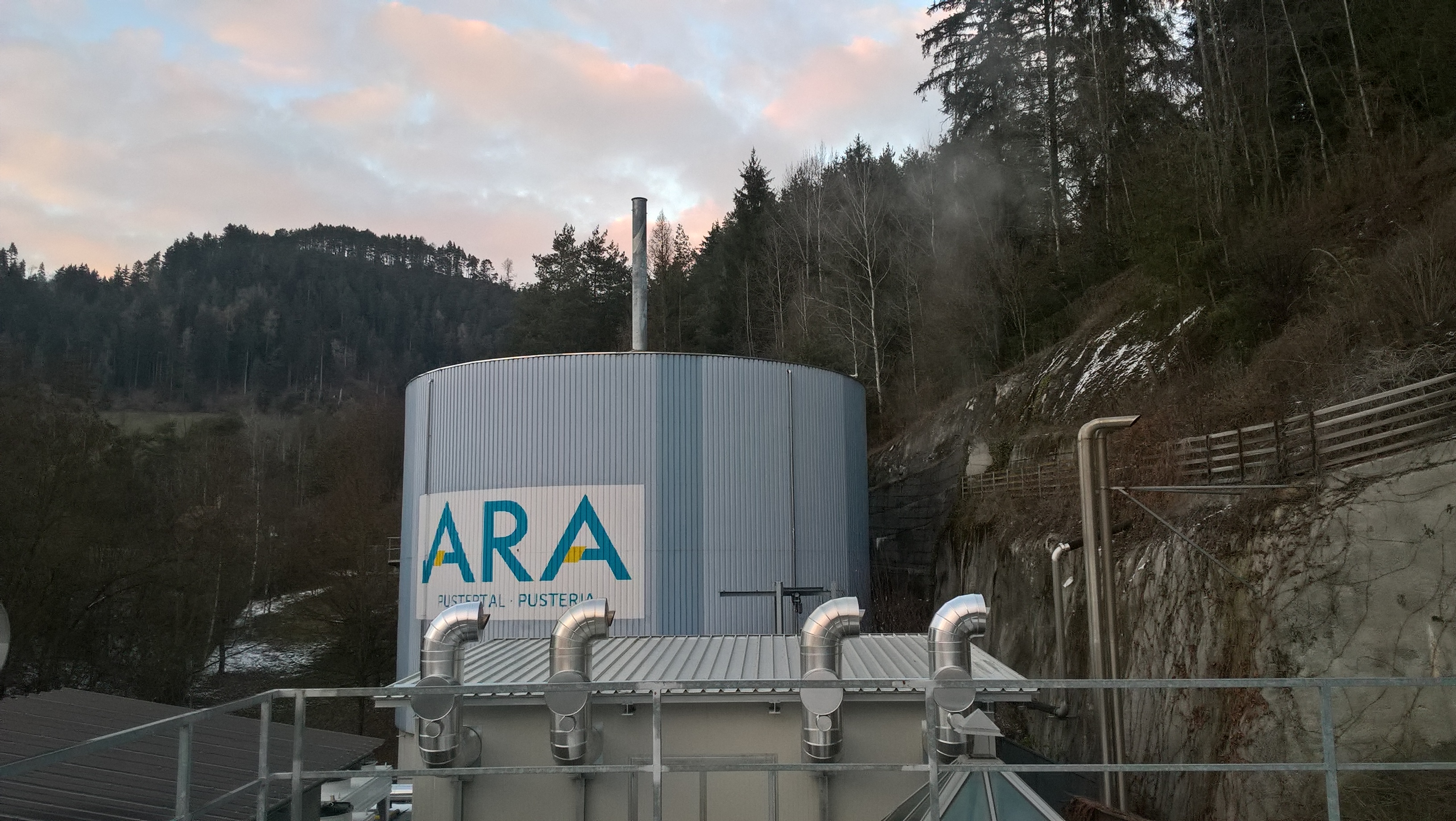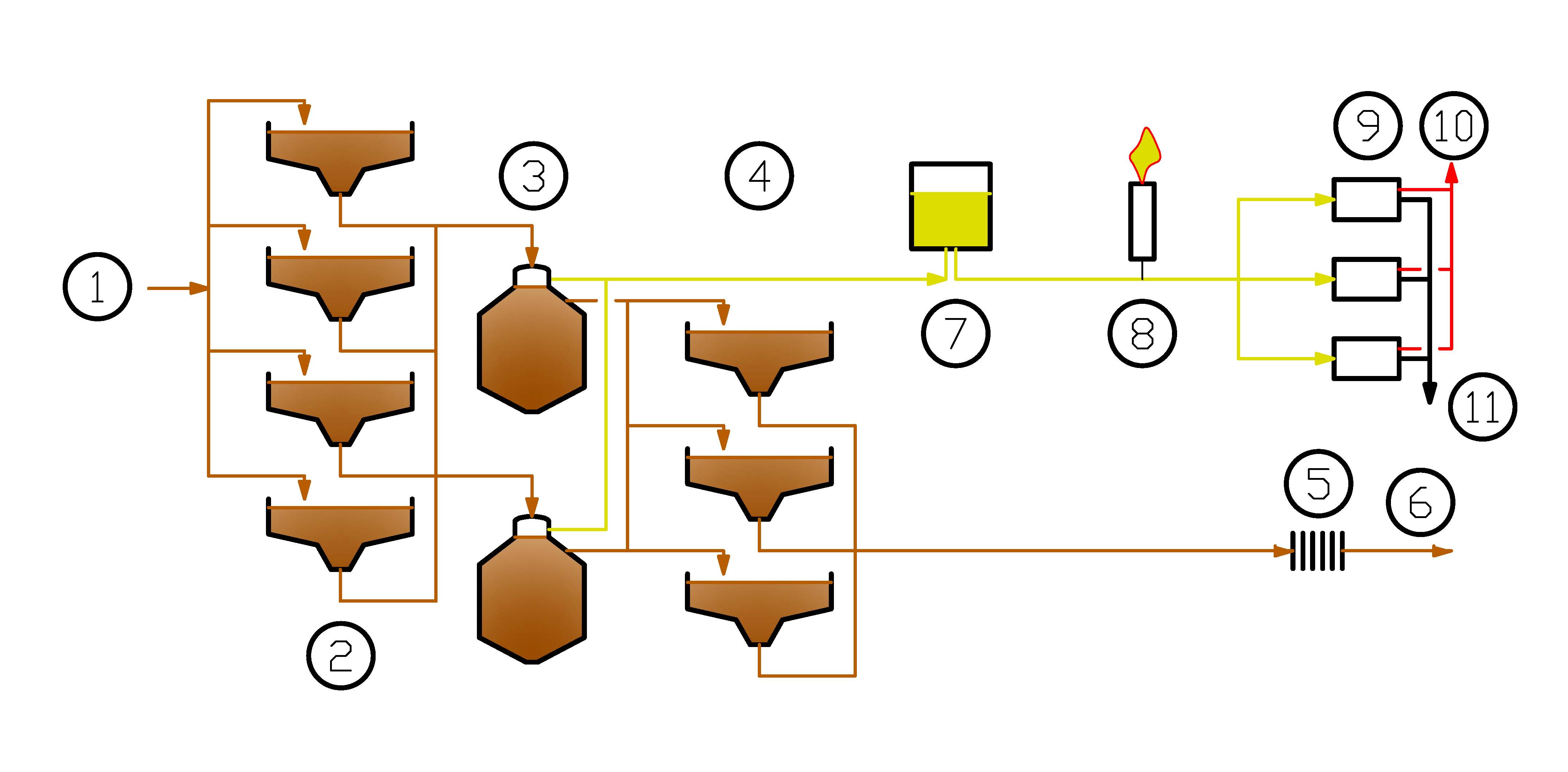 The sludge from the pre-clarification (primary sludge) [1] is statically dewatered in the pre-thickeners [2]. The excess sludge is removed from the final clarifier [1] and dynamically dewatered via the screening belt. It is then heated to 40°C and digested in an airtight digester [3]. The sludge stabilized in this way is then dewatered with screw presses [5].