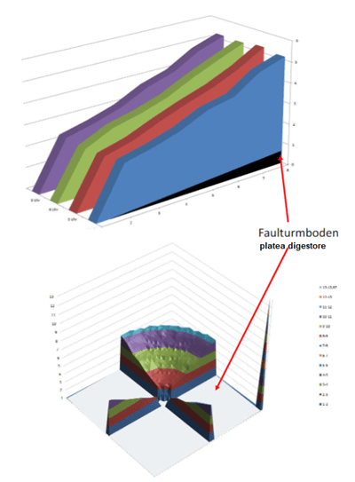 È chiaramente visibile che il centro della torre di digestione è quasi privo di depositi, ma dopo soli 2 metri i vecchi depositi salgono a circa 2,5 metri e terminano alla periferia della torre di digestione ad un'altezza di circa 5 metri. Nell' altro immagine, si possono vedere i depositi trasferiti sulla sezione trasversale della torre di digestione.